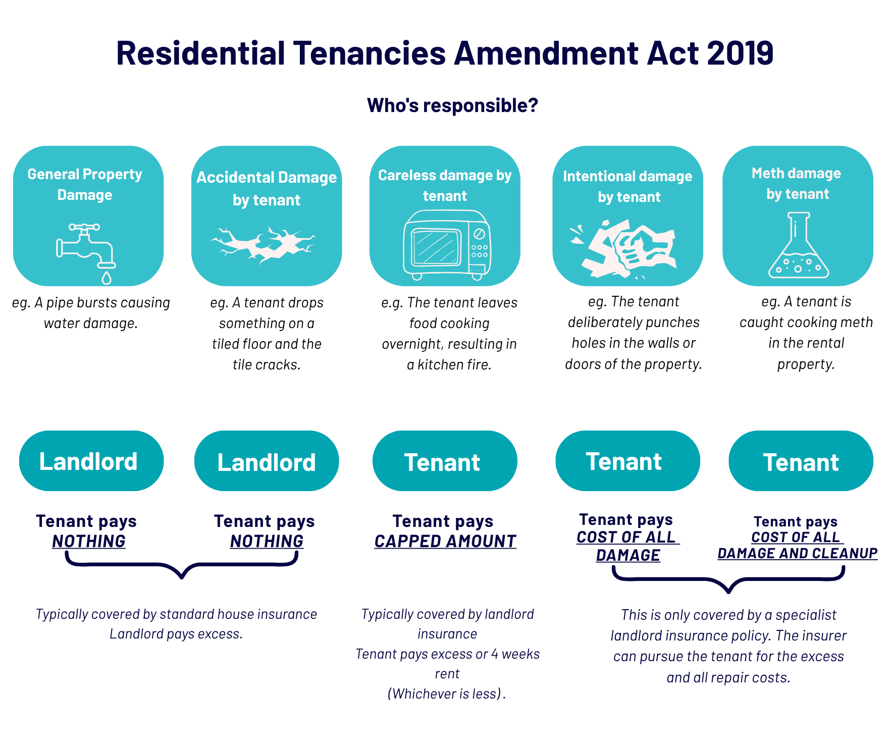 Under New Zealand's Residential Tenancies Act, a tenant's responsibility for property damage varies based on the nature of the damage: